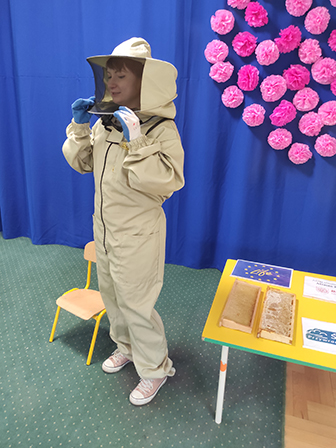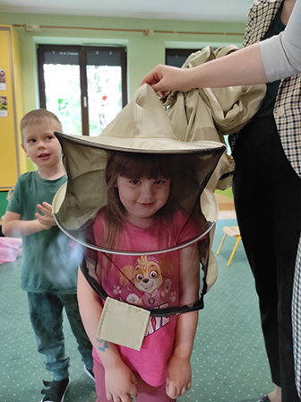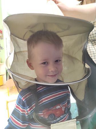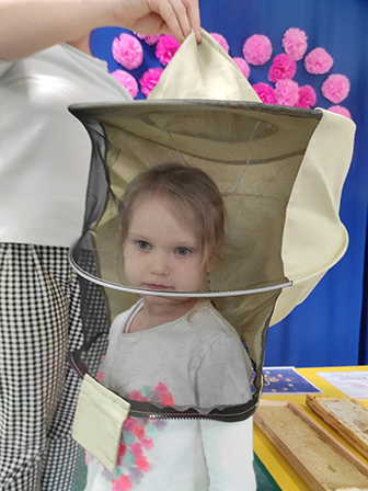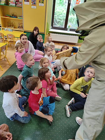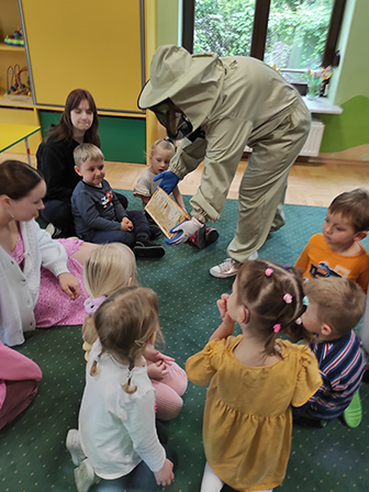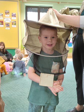 Dzieci dowiedziały się jak wyglądają pszczoły, czym zbierają nektar i pyłek z roślin oraz poznały ich ważną rolę w przyrodzie. Pani pszczelarka zaprezentowała swój strój i opowiedziała o produkcji pysznego miodu.