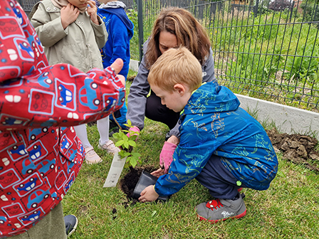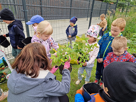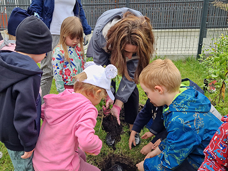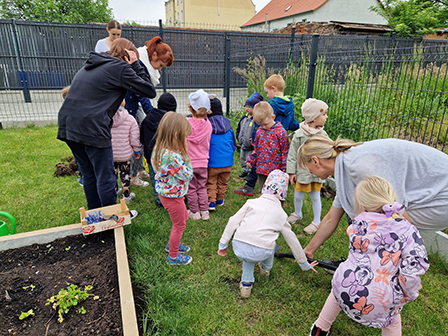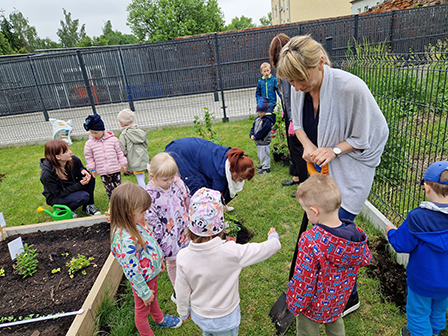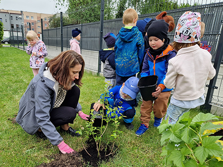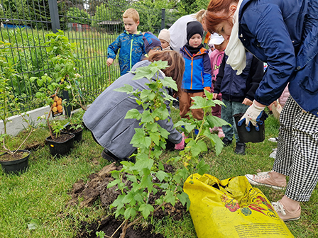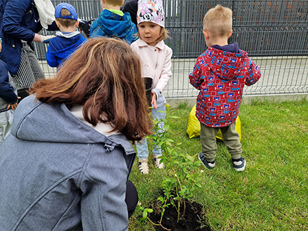 Biedronki mogły przymierzyć strój pszczelarza. Wszystkie dzieci chętnie słuchały ciekawych zajęć o tych pożytecznych owadach, a w nagrodę otrzymały odznaki Przyjaciela pszczół. Kolejnym zadaniem było przejście do naszego przedszkolnego ogrodu i posadzenie krzewów owocowych, by zachęcić pszczółki do wizyty w ogrodzie. Zasadziliśmy borówki amerykańskie, porzeczki i malinki. Już nie możemy się doczekać zbiorów tych pysznych owoców.