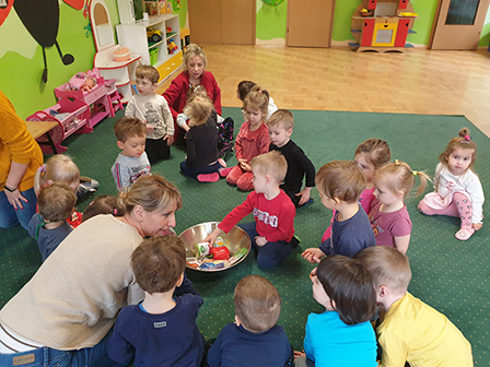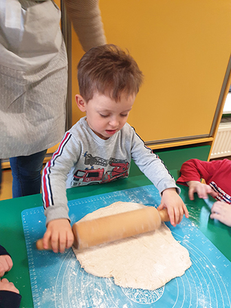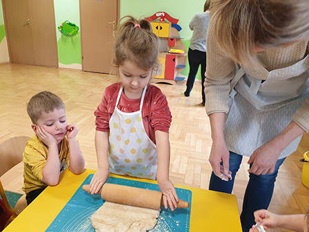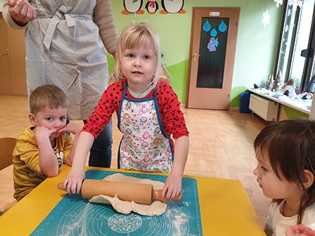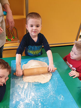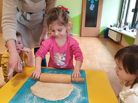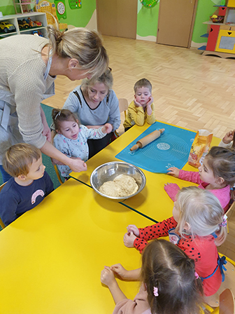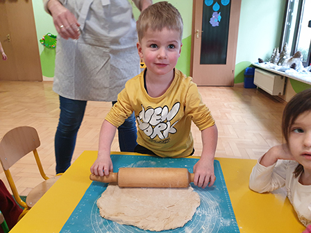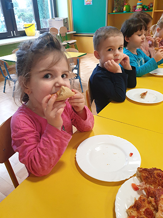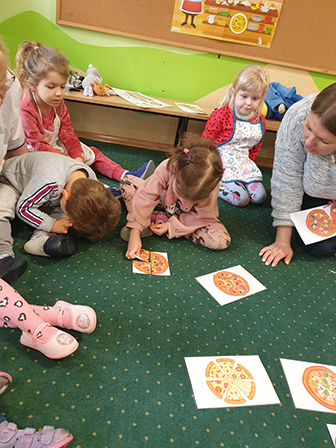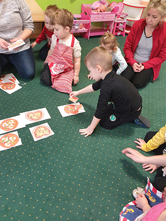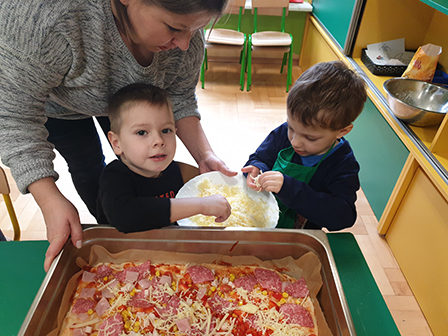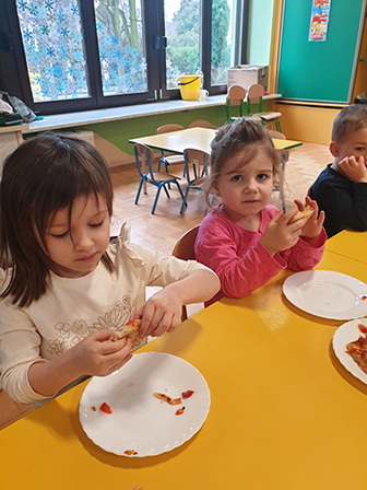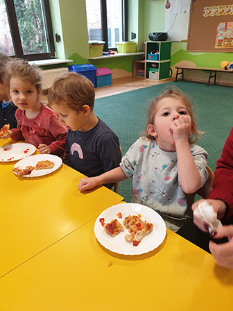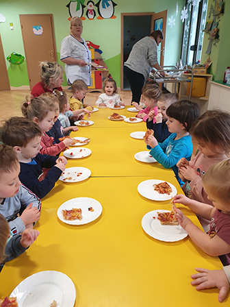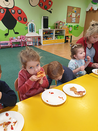 13 lutego Biedronki obchodziły Dzień Pizzy. Dzieci poznały historię tego pysznego dania. Zachęcone opowiadały o swoich ulubionych dodatkach, które przyniosły by „udekorować” nasze pizzę. Po umyciu rąk i założeniu fartuszków, zapoznaliśmy się ze składnikami potrzebnymi do wyrobienia ciasta. Ciasto potrzebowało chwili by odpocząć, a my zajęliśmy się układaniem „pizzowych puzzli „… Następnie zaczęliśmy tworzyć nasze pizze. Wałkowaliśmy ciasto, a gdy trafiło już na blachę zaczęliśmy dodawać ulubione dodatki. Czas oczekiwania na pieczenie, spędziliśmy na zabawie. A zwieńczeniem naszego Dnia Pizzy był oczywiście poczęstunek. Wszyscy zajadali się z dużym apetytem. Dziękujemy Rodzicom za pomoc w organizacji tych „pysznych” zajęć.