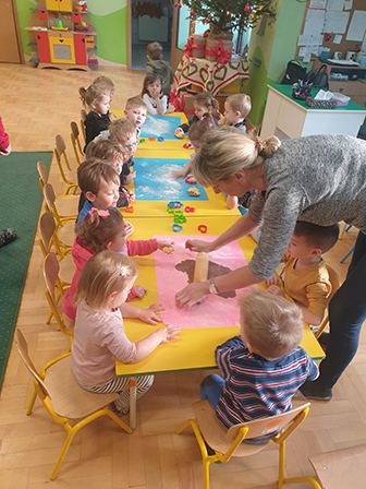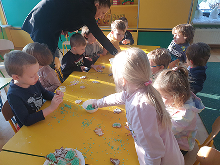 Dzieci z grupy Biedronek przygotowują się do tegorocznych Świąt Bożego Narodzenia wykonując różne zadania z kalendarza Adwentowego. Jednym z zadań było upieczenie ciasteczek świątecznych. Biedronki z zapałem zabrały się do pracy, bo takie „zadanie” – to sama przyjemność. Jednak większą radość dało zadanie, by udekorować nasze upieczone ciasteczka. Dzieci z zapałem smarowały lukrem ciasteczka i dekorowały je przyniesionymi przez rodziców ozdobami. Po skończonej pracy zajęliśmy się najlepszym, czyli degustacją słodkości. Wszystkim bardzo smakowały.